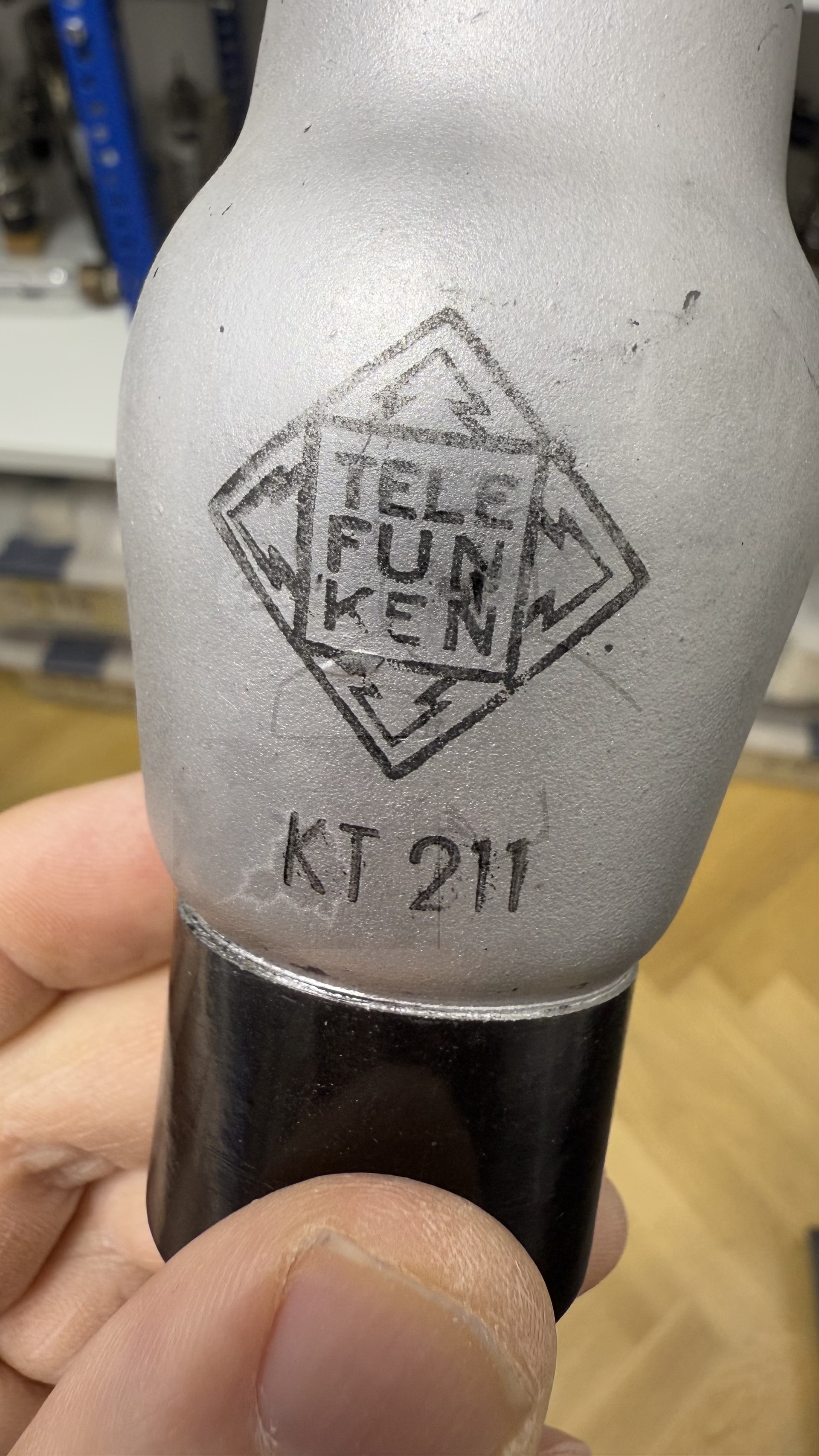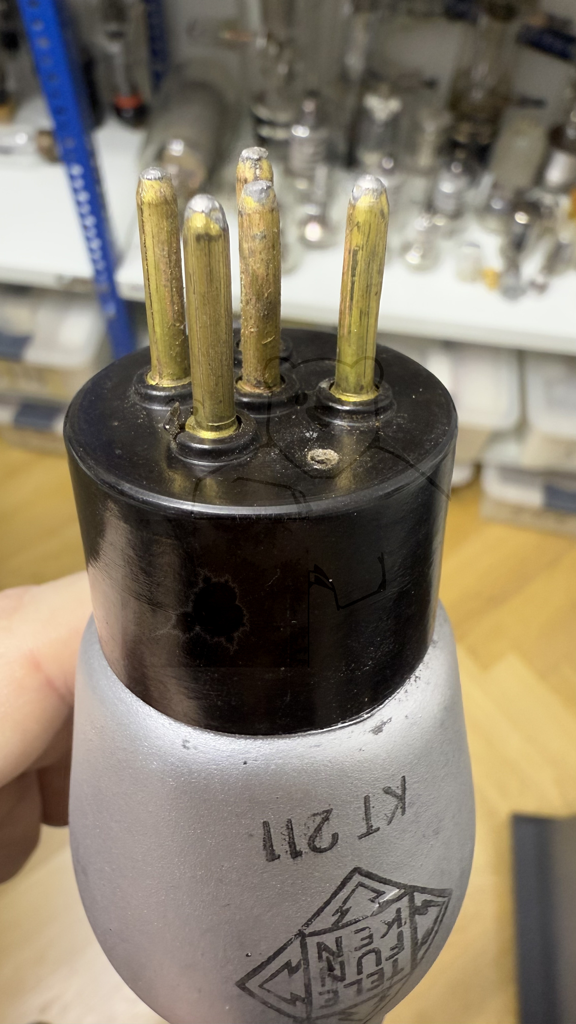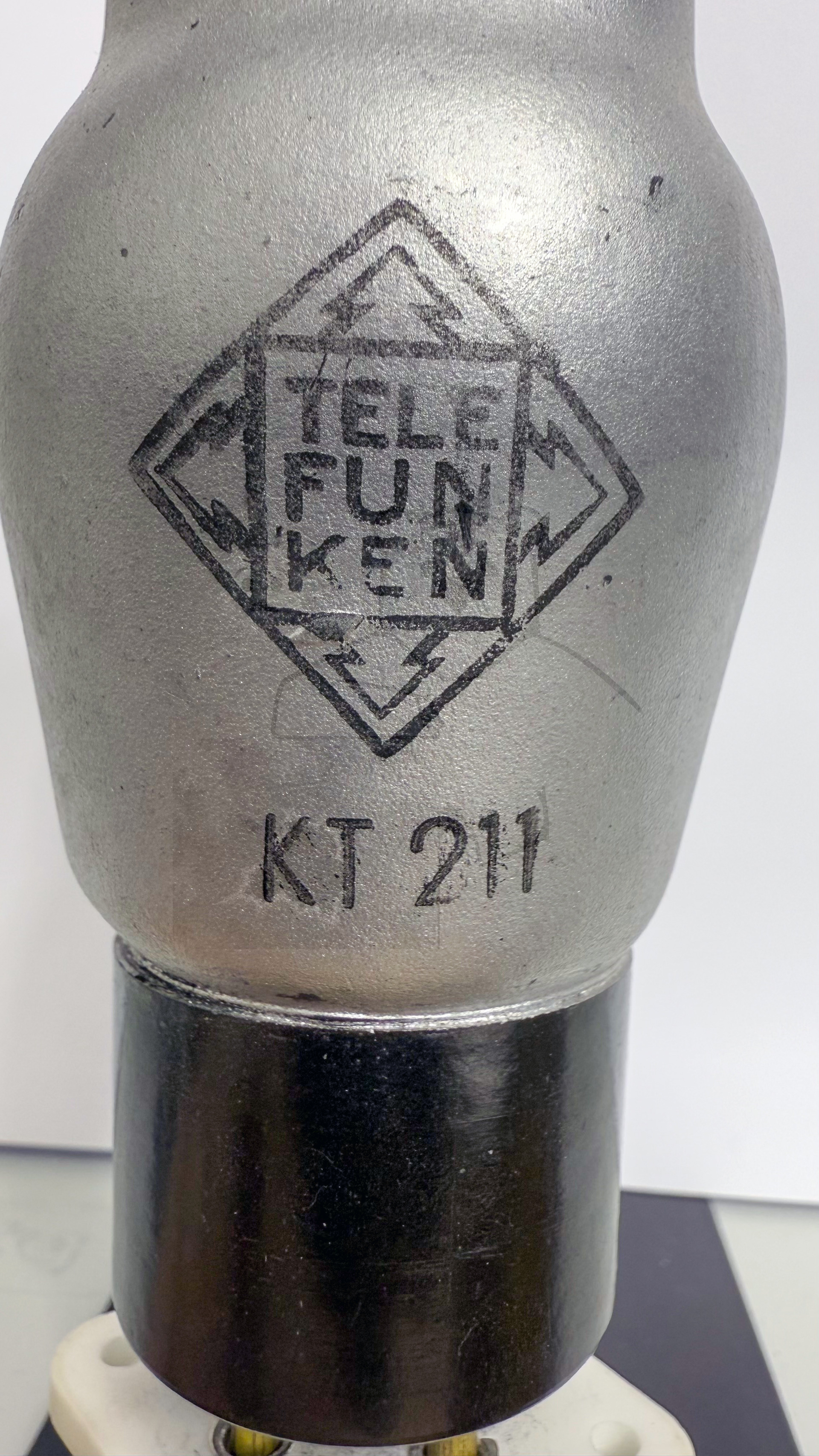 Für die Variante mit Europasockel existieren leider noch gar keine Daten bzw. Messwerte. Auffällig ist, das diese Variante als Pentode aufgeführt ist. Das dritte Gitter ist direkt mit der Kathode verbunden. Dieses dritte Gitter fehlt der Stahlröhrenvariante. Eventuell wurde diese Variante der KT211 nicht von Telefunken produziert, sondern von AEG. Auf dem Sockel fehlt der Telefunken-Datumscode sowie hat die Röhre von der äusseren Erscheinung sehr starke Ähnlichkeiten mit den AEG-Weitverkehrsröhren dieser Zeit. Bild 1.jpg)