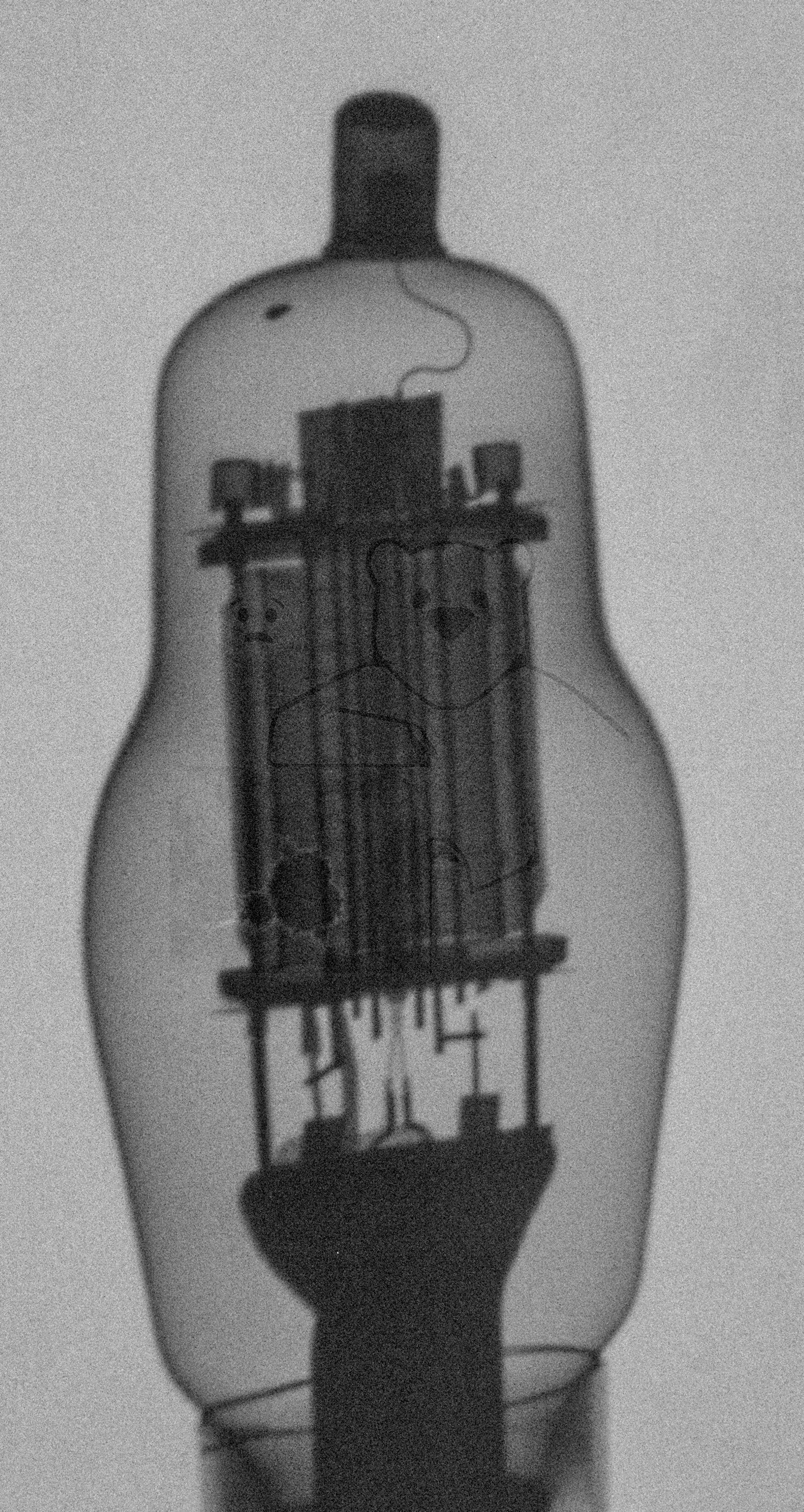 Da zu dieser Röhre kein Datenblatt zu finden ist, habe ich über ein Röntgenbild versucht, die Belegung der Stifte herauszufinden. Durch die lange Belichtungszeit (wg. Stahlmantel) war leider kein scharfes Bild möglich, allerdings reicht es für die Bestimmung der Belegung. Die Röhre selbst ist eine Tetrode, erkennbar ist das Kathodenröhrchen in der Mitte, die in nächster Nähe angebrachten Haltestege für g1, sowie in Nähe der Anode das Raumladegitter g2. Ebenfalls ist der Getterring erkennbar. Die Stiftbelegung entspricht (bis auf g3) der → EF12, deshalb wurde die Röhre auch auf einem Neuberger 370/1 als → EF12 getestet. Dabei wurden folgende Werte festgestellt, die Vakuumprüfung ist unauffällig verlaufen.- Ua=+250 V